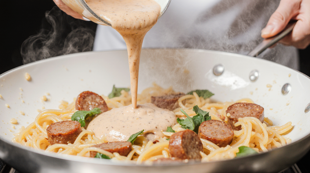 With your sauce ready, it’s time to bring the dish together. Add the cooked pasta to the skillet, tossing it in the creamy Cajun sauce until well coated. Return the cooked sausage to the skillet, stirring to combine.
