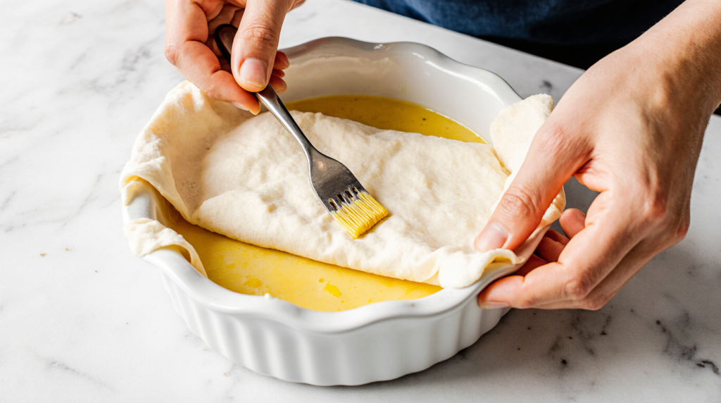 Preheat your oven to 400°F (200°C). Roll out the puff pastry on a lightly floured surface to a thickness of about 1/8 inch. Spoon the cooled filling into a 9×13 inch baking dish. Brush the edges of the dish with the beaten egg mixed with water.