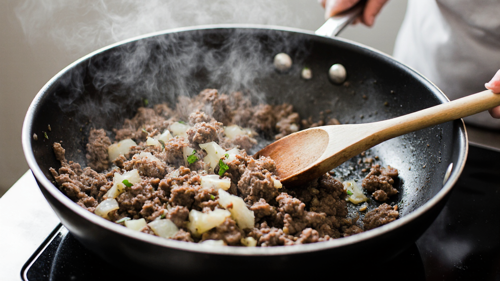 Cooking the meat is a crucial step in making Sloppy Joes. Use a large skillet over medium-high heat to brown 1 pound of ground beef. Break the meat apart as it cooks to ensure it is evenly browned.